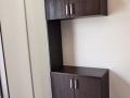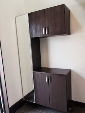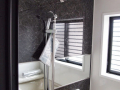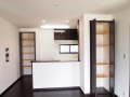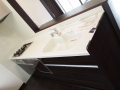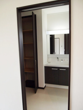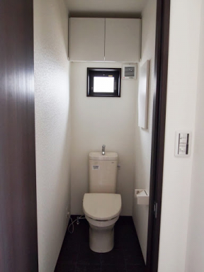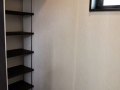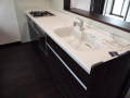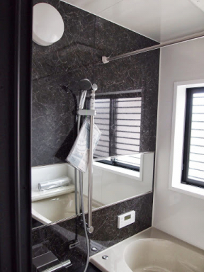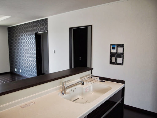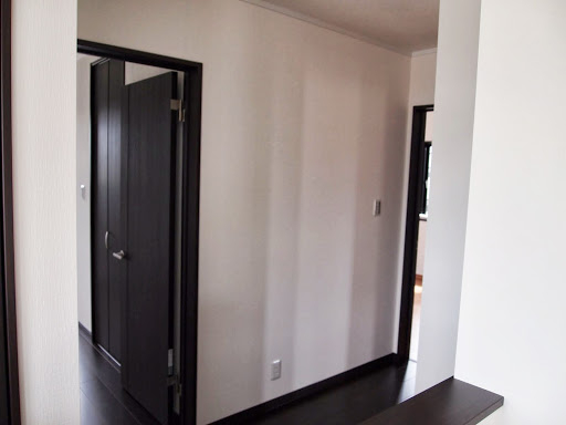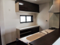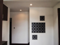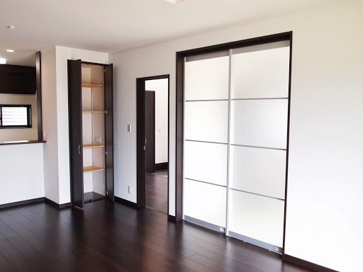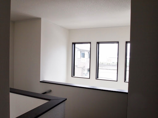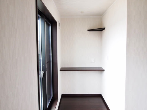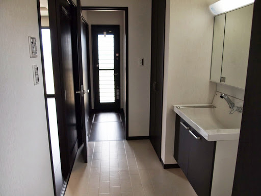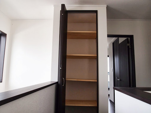 明るくて開放的な玄関の正面にあるニッチ(飾り棚)と、黒を基調とした内装がいい感じになっています。 LDKにある2ヶ所の収納は使い勝手のよい可動棚です。 キッチンの背面収納の間に窓を設置しているので、明るく風通しのいいキッチンになっています。